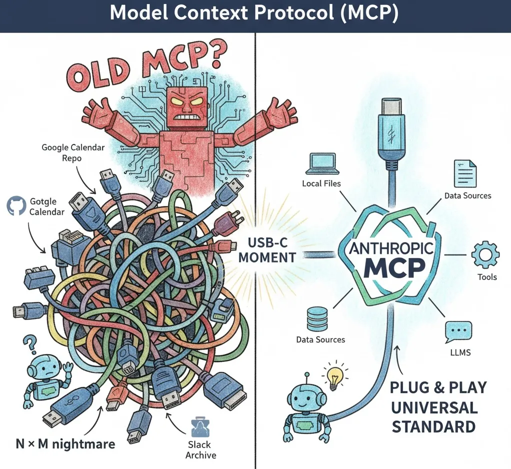 想象一下,你是一个 AI 开发者。你想让你的 AI 读取用户的 Google Calendar,你需要写一套 API 对接代码;下周你想让它读取 GitHub 代码库,又要写另一套代码;再过几天老板让你接通公司的 SQL 数据库,还得再写一套……